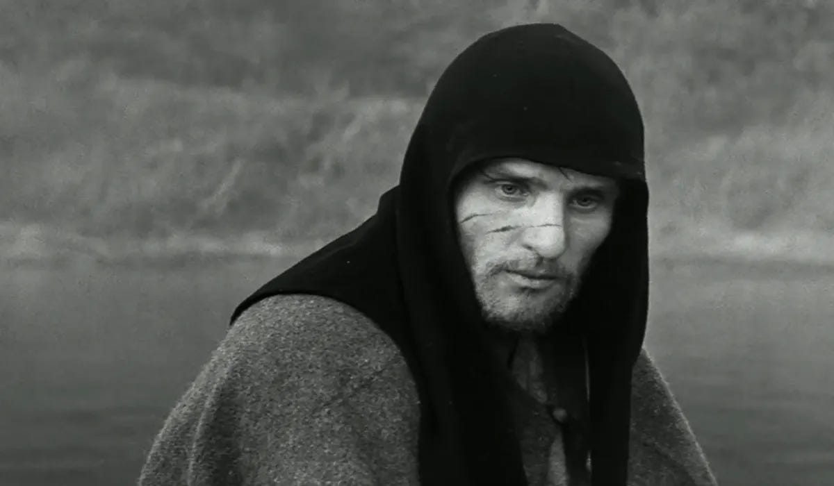 I’ll save my thoughts on the film’s biggest chapters—the pillaging of Vladimir and “The Bell”—for later, because they’re worth unpacking at greater length, but I do appreciate the way Tarkovsky sequences the film to where these setpieces come toward the end, like a snowball effect in Rublev’s conscience. As for the contemporary political context, our old friend and colleague Matthew Dessem, in his Criterion Contraption entry on the film, feels it’s “impossible to watch this movie without thinking of Stalin,” who ruled the country with cruel severity for the first 20 years of Tarkovsky’s life. Those are formative years for Tarkovsky as a young person with an artistic sensibility and he surely put himself in the mind of an icon painter coming into his own in an environment where humane art must have seemed impossible.