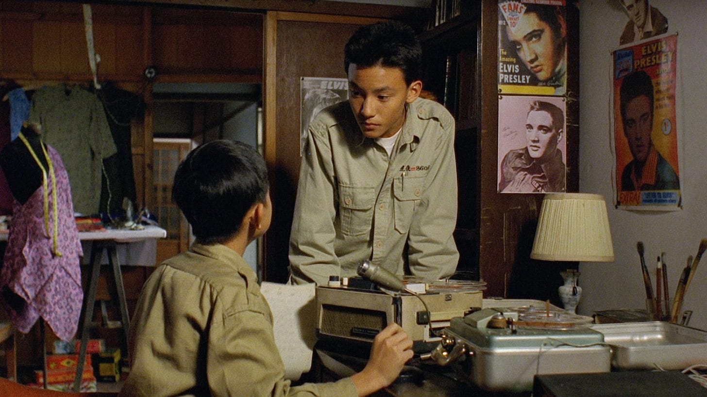 Scott: No doubt. The scenes of Cat singing in that angelic voice are so startling and beautiful, and I love the specificity of that obsession, of translating American pop songs for performances and recordings. It’s moments like those when the memoir-like qualities of A Brighter Summer Day really shine, because so much effort has been put into drawing out these small details. Even the family radio has its own minor dramatic arc, as an important conduit of entertainment and information that goes through various states of disrepair. The music in A Brighter Summer Day—and the white t-shirt with rolled up sleeves that Cat and others are often wearing—gives the impression of American influence in Taiwan at the time, as the island seethes with tension between East and West, Communist and anti-Communist forces, and suspicion between residents and the influx of newcomers from mainland China.