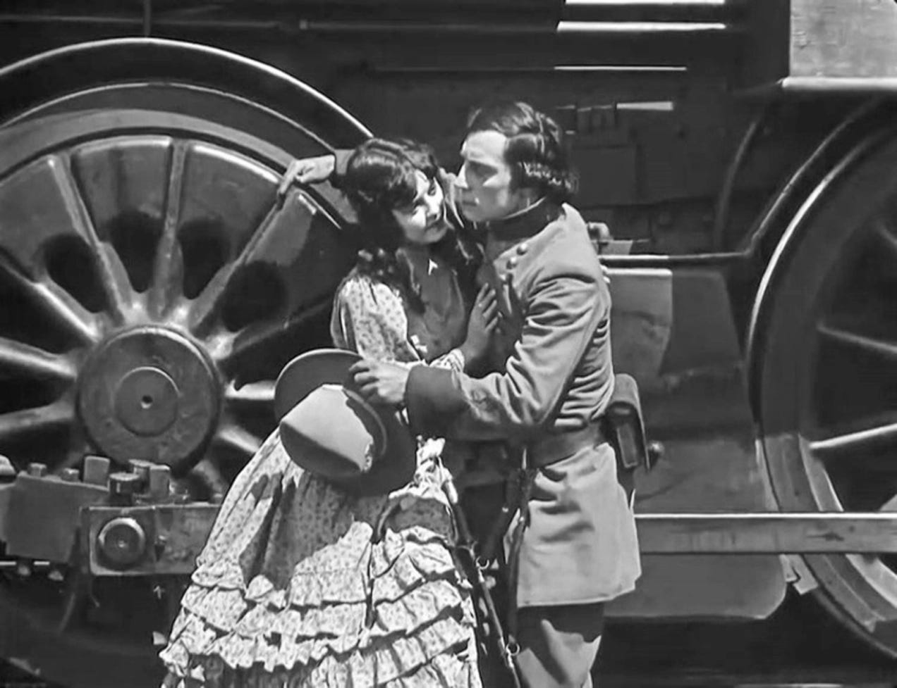 But, beyond that, Annabelle’s refusal to love Johnnie unless he proves himself loyal to the cause and ready to sacrifice his life for it is a little queasy-making, isn’t it? “The General” and Annabelle may be Johnnie's two great loves, but the train arguably earns it more than she does. When I say it’s not my favorite Keaton, that’s in part because I respond to the more emotional elements of Keaton’s films and the scenes of him as a consummate misfit trying to fit in with the rest of the world. Confined to the film’s opening stretch, those are the weakest parts of The General.
