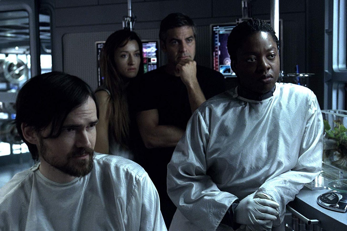 Soderbergh’s film is lockstep tonally with Cliff Martinez’s score, which bounces swelling strings against pulsing percussion provided by steel drums and xylophones in ways that suggest strong emotions but refrain from specifying just how those in the audience should feel about what they’re experiencing.** The situation of Chris and the others caught in Solaris’ orbit at times doubles as a metaphor for depression, but it’s never just that. In a 2003 interview Soderbergh said he saw the planet Solaris “as a very convenient and wonderful metaphor for anything that you don't understand.” The Solarian visitors are terrifying and seductive, but perhaps mean no harm as they tap into the deepest feelings of those they encounter and force them to revisit and reconsider the most important moments in their lives, with all the attendant feelings of joy and pain.