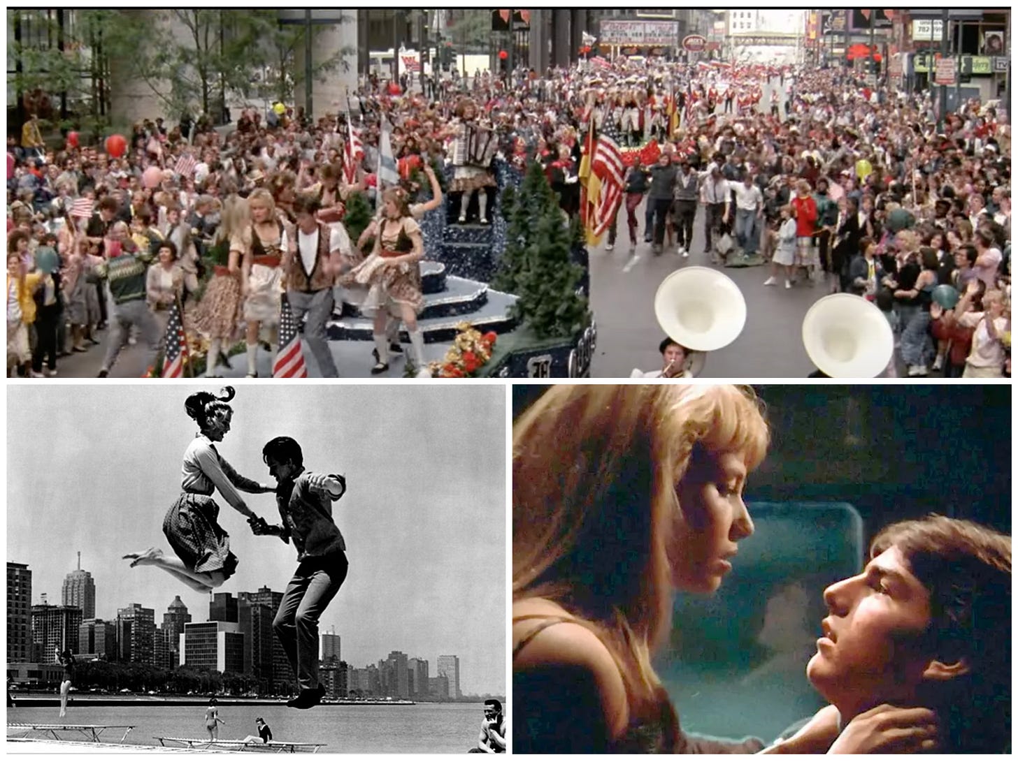 Movies filmed in Chicago thinned out during Hollywood’s golden age, as the center of filmmaking gravity shifted west and on location filming became a rarity, but occasionally filmmakers would remember the Second City had its uses, and things started to pick up in the 1960s. The home from A Raisin in the Sun still stands, for instance, as does the exterior at least of the Kitty Kat Club, a South Side gay bar that also served as a filming location. One of the pleasures of Arthur Penn’s Mickey One is that it seems to come from an alternate universe, one in which the French New Wave took place not next to the Seine but on the banks of the Chicago River. About halfway through, Penn drops in a shot of Warren Beatty and Alexandra Stewart jumping on a trampoline in slow motion on the shore of Lake Michigan before cutting to a shot of the couple in bed. (It’s a symbol, see.) I like the movie as it is, but I can’t help but wish for more such shots.