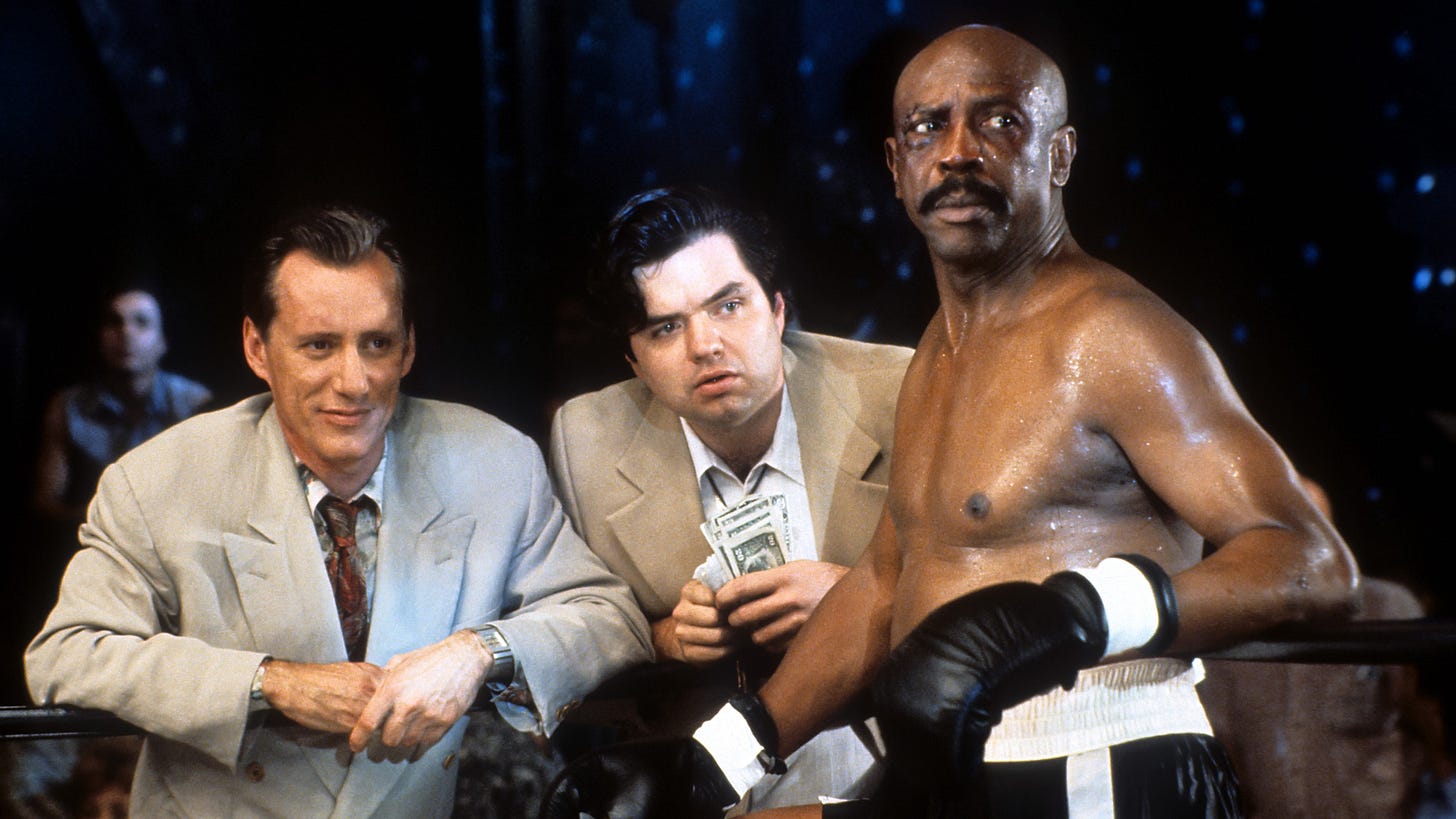 Released to middling reviews and anemic returns, Diggstown seemed to gain momentum on video and television as an unpretentious pugilistic entertainment like The Sting, a twisty affair with ace con men working to scheme each other out of a fortune. But that “momentum” could be strictly anecdotal on my part, a cult limited to a small handful of appreciators in Athens who half-watched it while dubbing $5 pornography rentals on their second VCR. Yet it’s pleasant to think about the film as a scrappy comeback for everyone involved, including its director Michael Ritchie, who’d been in a steep decline since his ‘70s heyday, and character actors like Gossett, who’d had hits in the mid-‘80s with Enemy Mine and Iron Eagle, but had squandered the years afterwards on Iron Eagle sequels and dogs like The Principal and The Punisher. It’s the type of film that encourages rooting interests.
