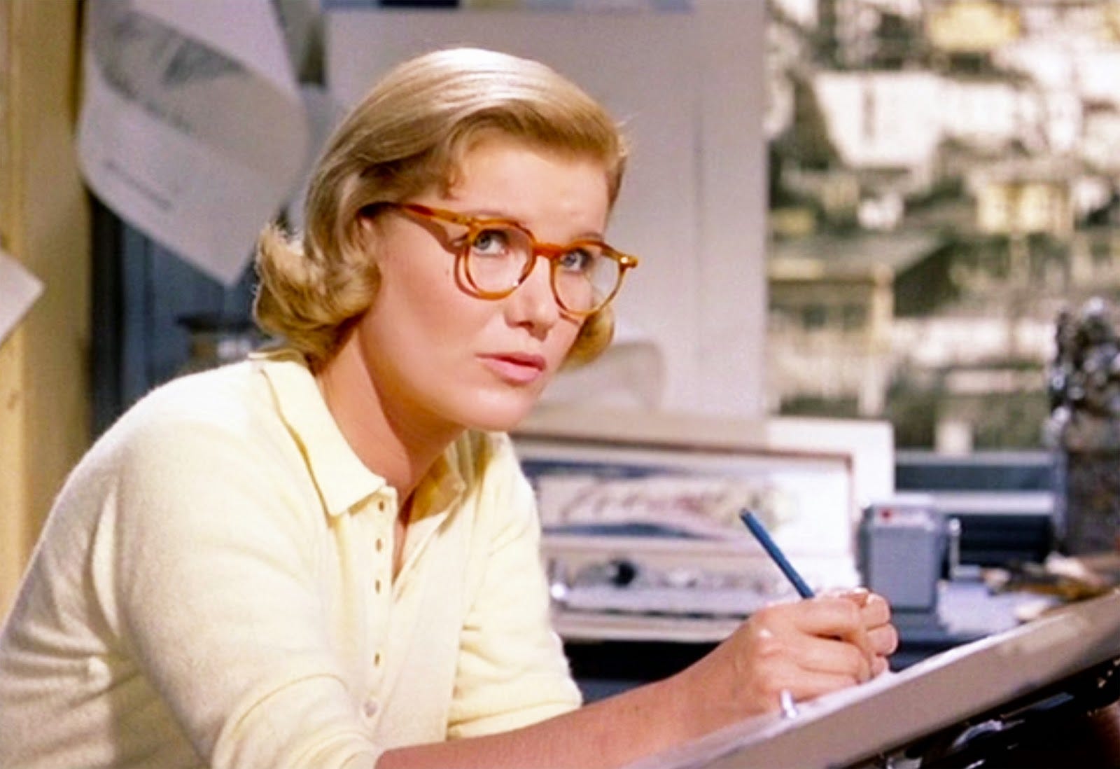 On the face of it, Midge has a simple role to play, that of the woman with whom Scottie is not in love. But the film complicates this from the start. Apart from the policeman who falls to his death offering Scottie his hand, she’s the first character to have a line in the film. She’s introduced in a two-shot sitting at her drawing board in her San Francisco apartment while Scottie relaxes across the room. It’s a cozy, domestic scene—or would be, if they were a couple.