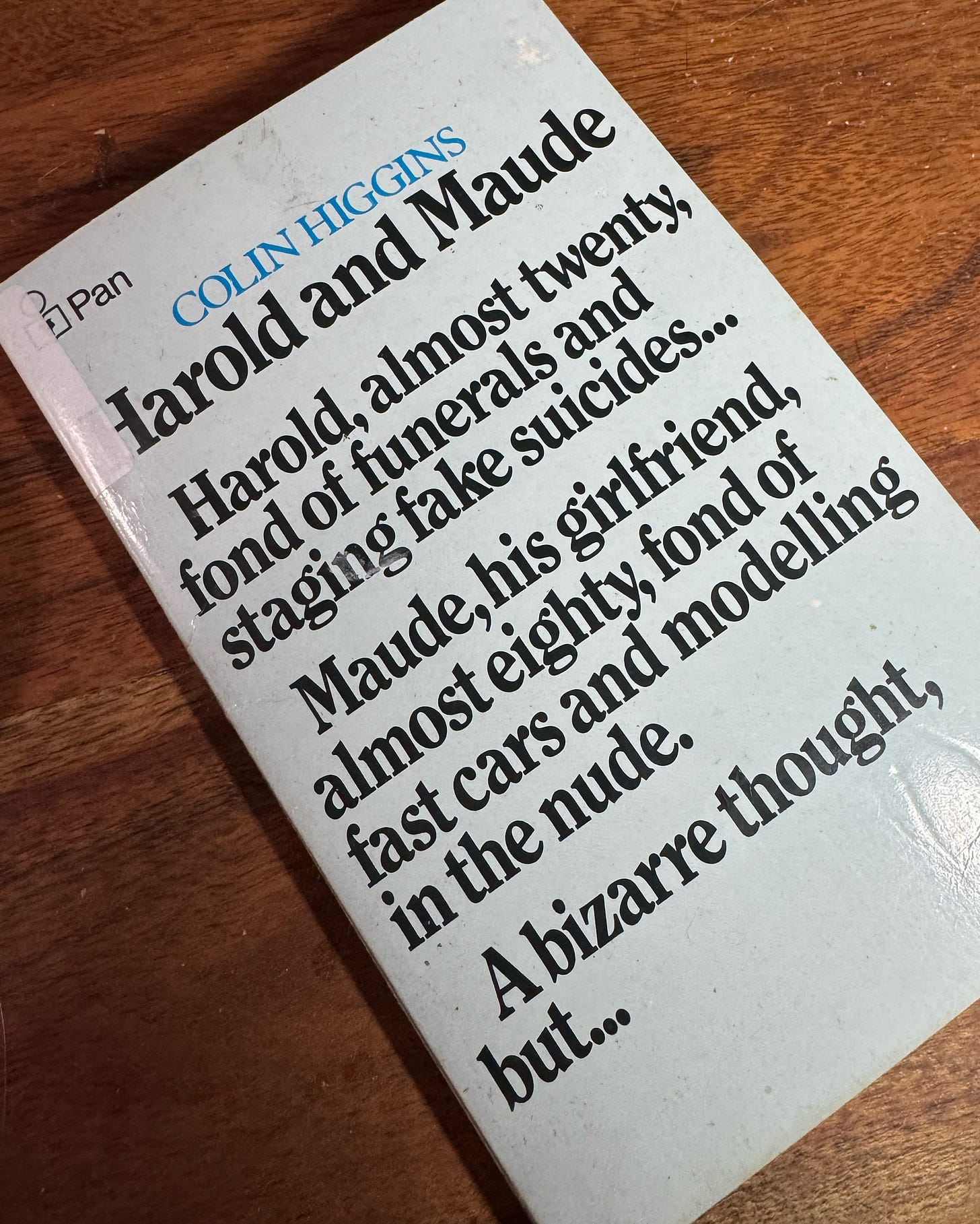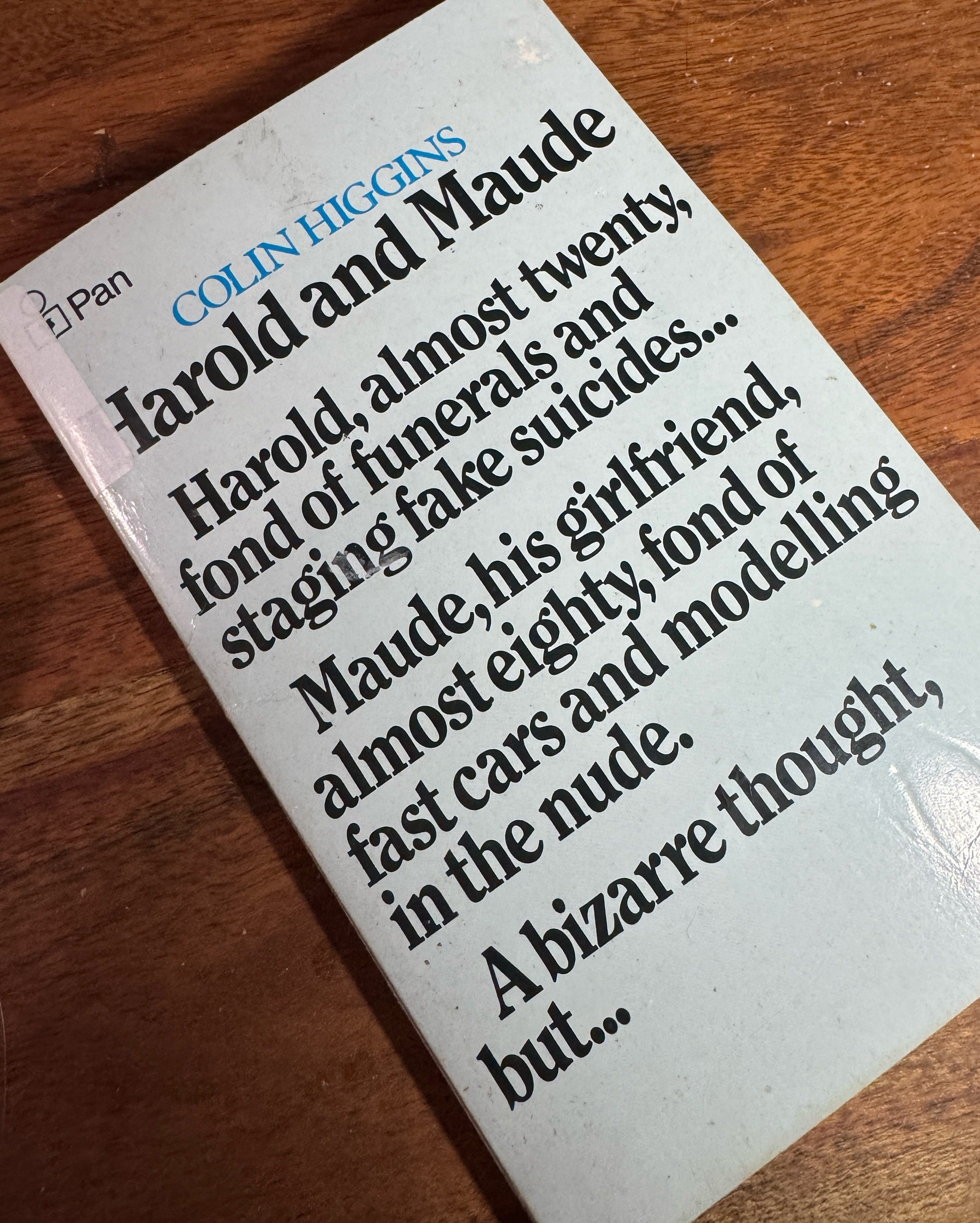 My copy of Harold and Maude looks a little different. A tattered paperback picked up secondhand, its all-text cover also doesn’t mention the movie, instead offering a thumbnail sketch of the premise via short descriptions of Harold and Maude before ending with an ellipses: “A bizarre thought, but…” The novel completes the thought.