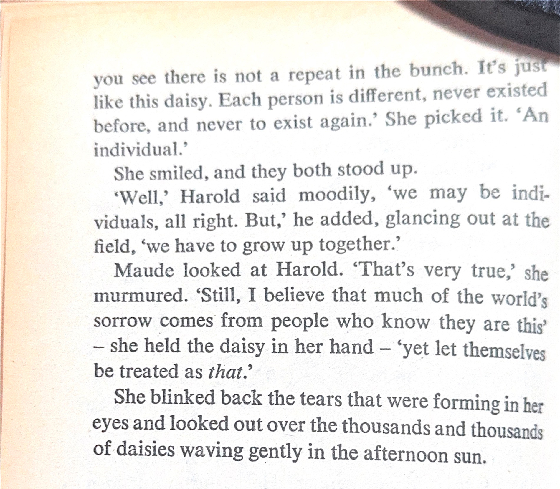 Higgins’ novel reflects his screenplay, where Maude’s “that” refers to the mass of daisies around them, where no single flower stands out from the crowd. Ashby’s film moves to a cemetery on the cut as the camera zooms out, out, out, then further out still to reveal the city of the dead around the couple, who remain discernible details within the frame no matter how much their surroundings dwarf them—all to the accompaniment of one of the bittersweet Cat Stevens songs that serve as the film’s soundtrack.