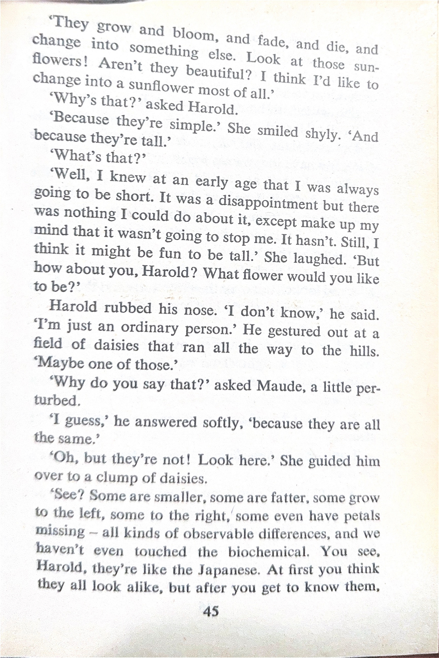 The name of the book: Harold and Maude. Unmentioned: that a film of the same name, directed by Hal Ashby and starring Bud Cort and Ruth Gordon, had already been produced and would arrive in theaters a few months later.
