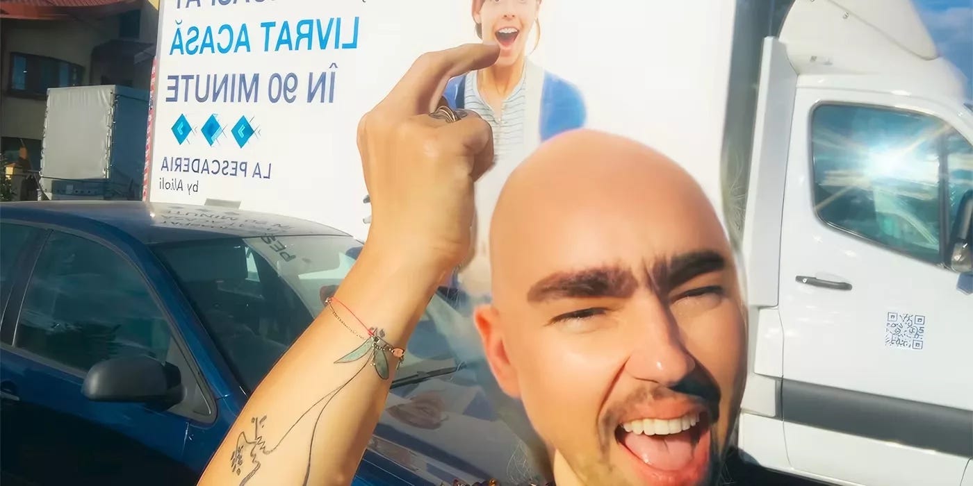 As Angela (Ilinca Manolache) drearily zips around Bucharest in her car, filming casting videos for a piece of workplace propaganda, she blows off steam by recording TikTok videos as “Bobita,” a profane misogynist that parodies Andrew Tate and other influencers in the manosphere. A perfectly lovely young woman, Angela disguises her identity by activating a filter that turns her into a bald-headed man with a thick unibrow and a deep voice—a persona Manolache had honed before shooting. Sometimes great special effects bust the budget and sometimes they’re just sitting there on your new phone.